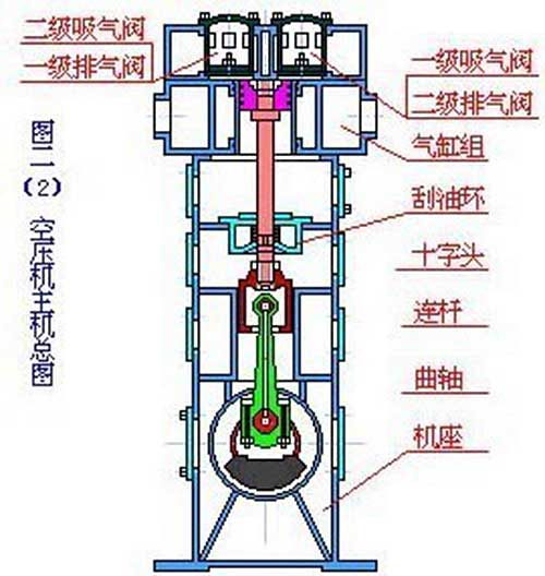 活塞式空氣壓縮機的工作原理:活塞式空壓機在氣缸內作往復運動的活塞向右移動時,氣缸內活塞左腔的壓力低于大氣壓力,吸氣閥開啟,外界空氣吸入缸內,這個過程稱為壓縮過程。當缸內壓力高于輸出空氣管道內壓力后,排氣閥打開?;钊耐鶑瓦\動是由電動機帶動的曲柄滑塊機構形成的。曲柄的旋運動轉換為滑動--活塞的往復運動。這種結構的壓縮機在排氣過程結束時總有剩余容積存在。在下一次吸氣時,剩余容積內的壓縮空氣會膨脹,從而減少了吸入的空氣量,降低了效率,增加了壓縮功。