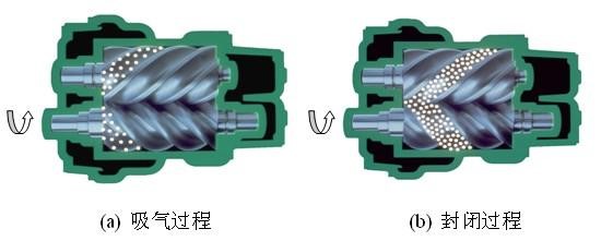 螺桿式空氣壓縮機的工作原理:電機驅動轉子,主從轉子的齒溝空間在轉至進氣端壁開口時,其空間大,外界的空氣充滿其中,當轉子的進氣側端面轉離了殼之進氣口時,在齒溝間的空氣被封閉在主、從轉子與機殼之間,完成吸氣過程。在吸氣結束時,主、從轉子齒峰與機殼形成的封閉容積隨著轉子角度的變化而減少,并按螺旋狀移動,此為壓縮過程。在輸送過程中,容積不斷減少,氣體不斷被壓縮,壓力提高,溫度升高,同時,因氣壓差而變成霧狀的潤滑油被噴入壓縮腔,從而達到壓縮、降低溫度密封和潤滑的作用。當轉子之封閉齒峰旋轉到與機殼排氣口相遇時,被壓縮的空氣開始排放,直到齒峰與齒溝的吻合面移至排氣端面,此時齒溝空間為零,即完成排氣過程。與此同時,主從轉子的另一對齒溝已旋轉至進氣端,形成大空間,開始吸氣過程,由此開始一個新的壓縮循環(huán)。